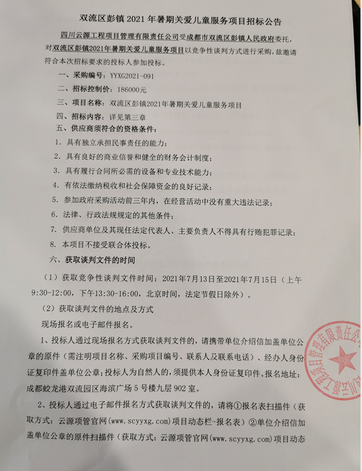 双流区彭镇2021年暑期关爱儿童服务项目招标公告