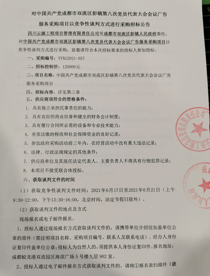 中国共产党成都市双流区彭镇第八次党员代表大会会议广告服务采购项目招标公告