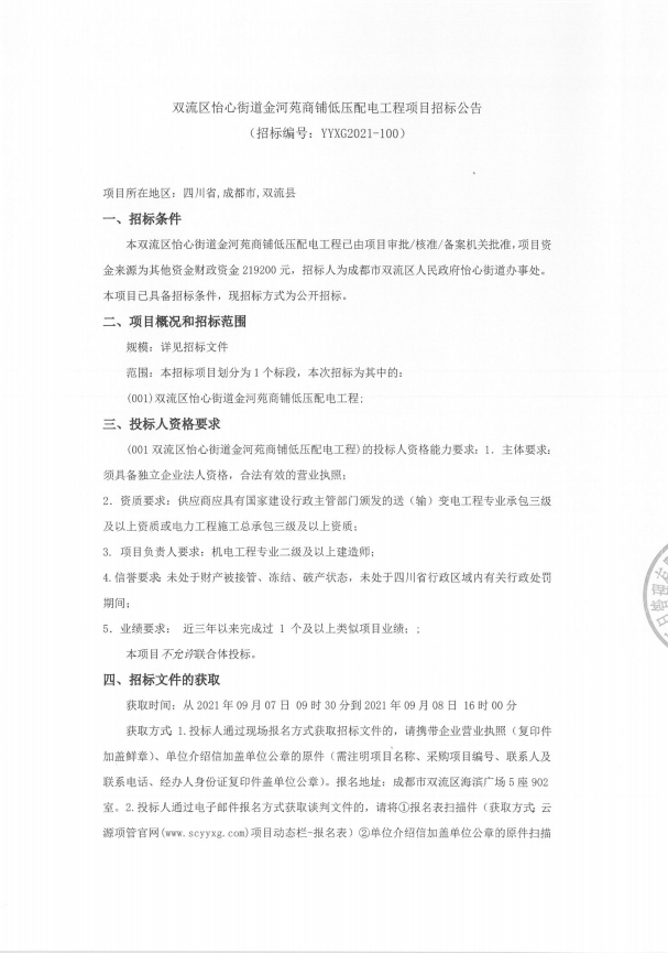 双流区怡心街道金河苑商铺低压配电工程招标公告