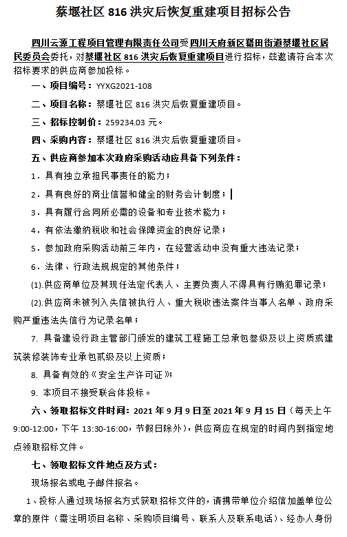 蔡堰社区816洪灾后恢复重建项目招标公告