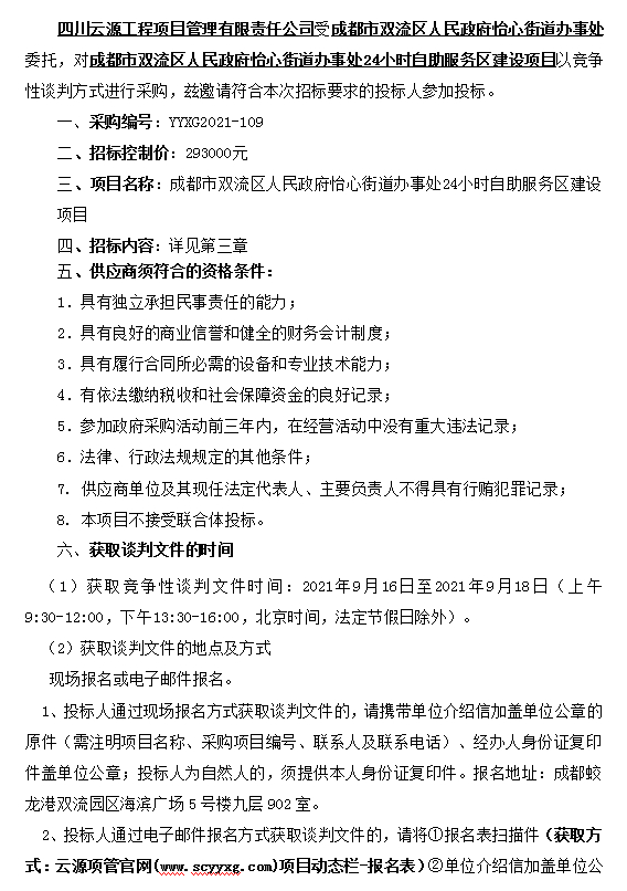 成都市双流区人民政府怡心街道办事处24小时自助服务区建设项目招标公告