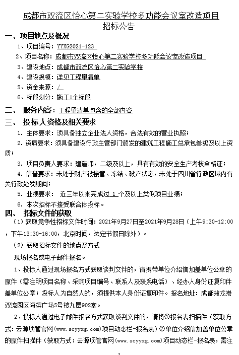成都市双流区怡心第二实验学校多功能会议室改造项目招标公告