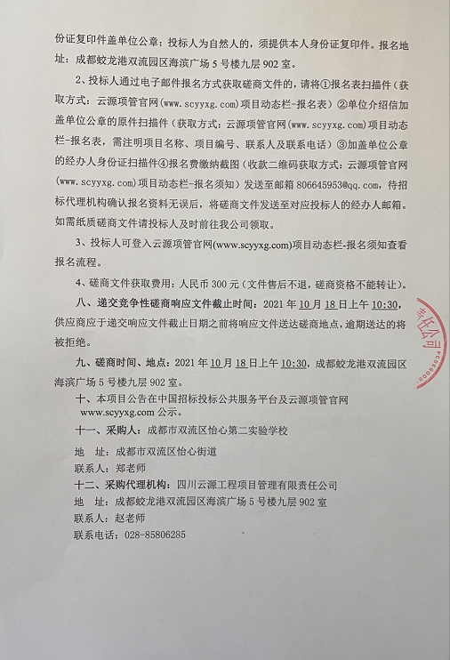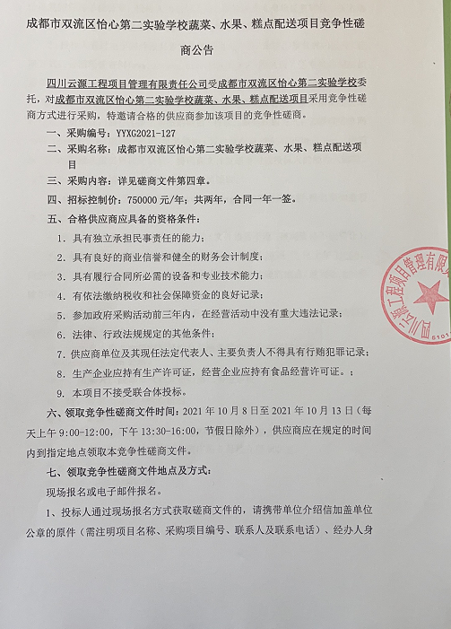 成都市双流区怡心第二实验学校蔬菜、水果、糕点配送项目竞争性磋商公告