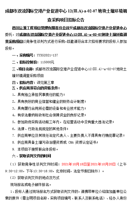 成都市双流国际空港产业促进中心12(Ⅲ.A)-a-02-07地块土壤环境调查采购项目招标公告