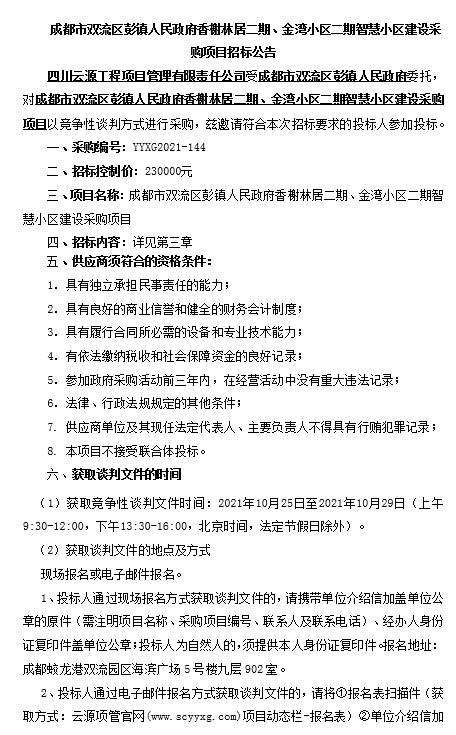 成都市双流区彭镇人民政府香榭林居二期、金湾小区二期智慧小区建设采购项目招标公告