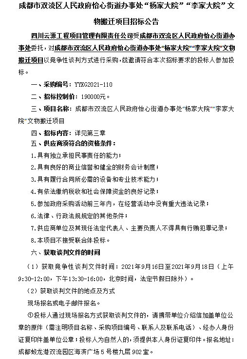 成都市双流区人民政府怡心街道办事处“杨家大院”“李家大院”文物搬迁项目招标公告