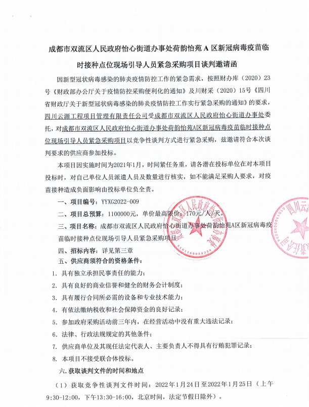 成都市双流区人民政府怡心街道办事处荷韵怡苑A区新冠病毒疫苗临时接种点位现场引导人员紧急采购项目招标公告