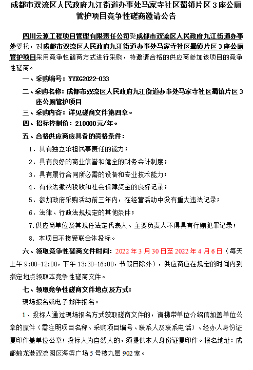 成都市双流区人民政府九江街道办事处马家寺社区蜀镇片区3座公厕管护项目招标公告