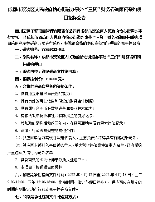 成都市双流区人民政府怡心街道办事处“三资”财务咨询顾问采购项目招标公告