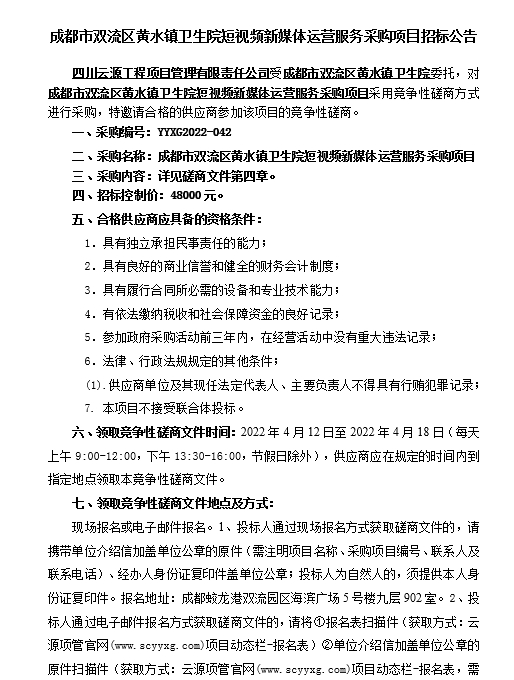 成都市双流区黄水镇卫生院短视频新媒体运营服务采购项目招标公告