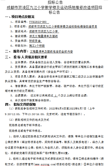 成都市双流区九江小学教学楼及运动场地维修改造项目招标公告