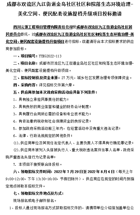 成都市双流区九江街道金岛社区社区和院落生态环境治理-美化空间、便民配套设施提档升级项目招标公告