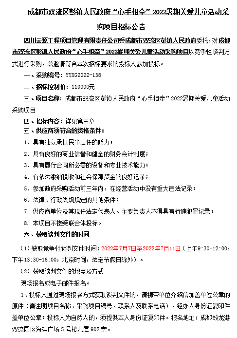 成都市双流区彭镇人民政府“心手相牵”2022暑期关爱儿童活动采购项目招标公告
