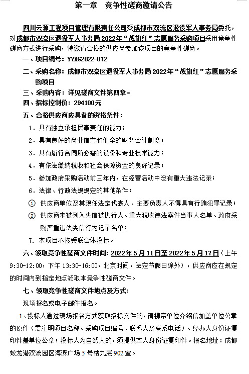成都市双流区退役军人事务局2022年“战旗红”志愿服务采购项目招标公告