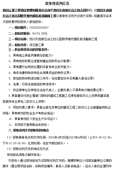 四川天府新区合江幼儿园教学楼内墙乳胶漆翻新工程招标公告