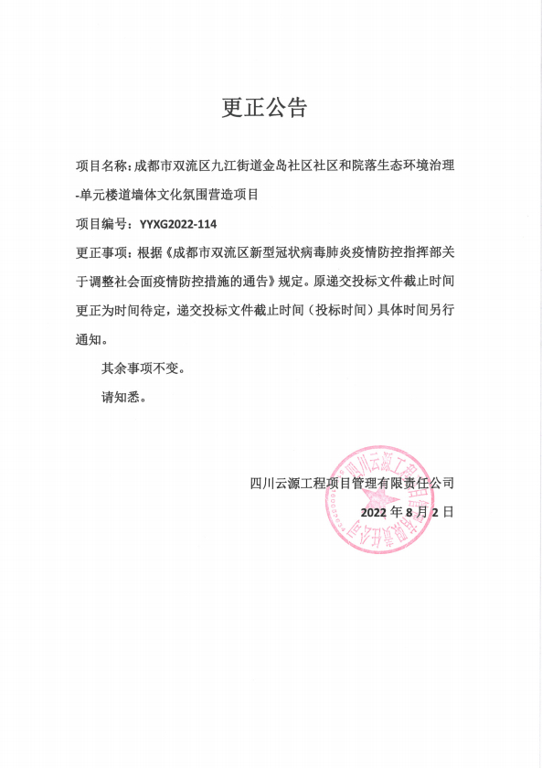 成都市双流区九江街道金岛社区社区和院落生态环境治理-单元楼道墙体文化氛围营造项目更正公告