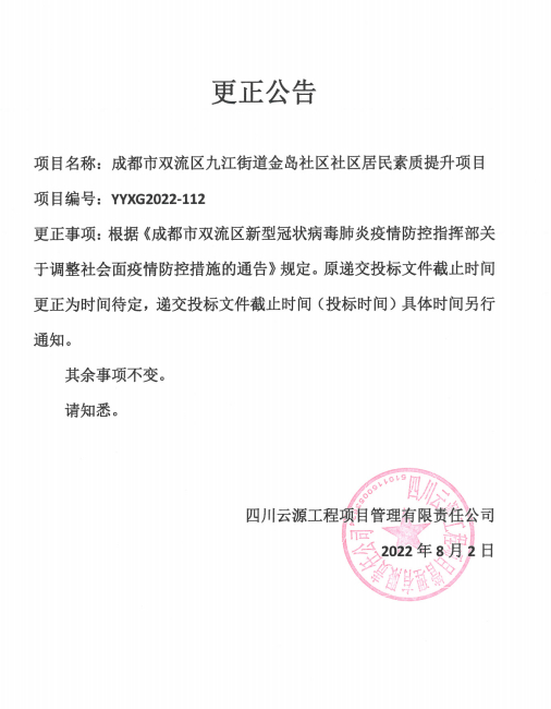 成都市双流区九江街道金岛社区社区居民素质提升项目更正公告