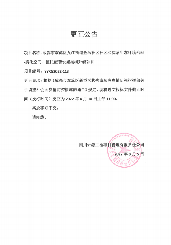 成都市双流区九江街道金岛社区社区和院落生态环境治理-美化空间、便民配套设施提档升级项目更正公告