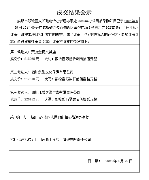 成都市双流区人民政府怡心街道办事处2023年办公用品采购项目成交结果公示