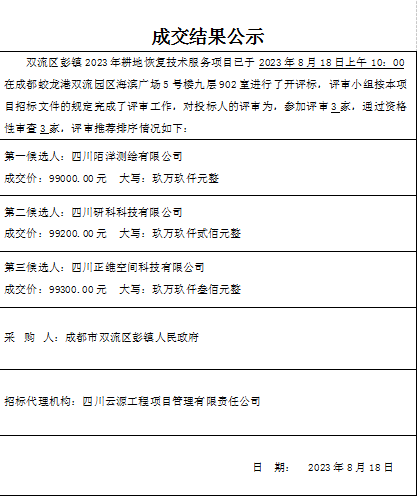 双流区彭镇2023年耕地恢复技术服务项目结果公示
