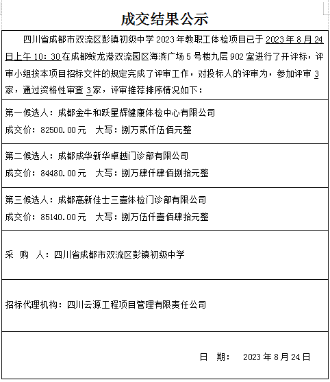 四川省成都市双流区彭镇初级中学2023年教职工体检项目结果公示