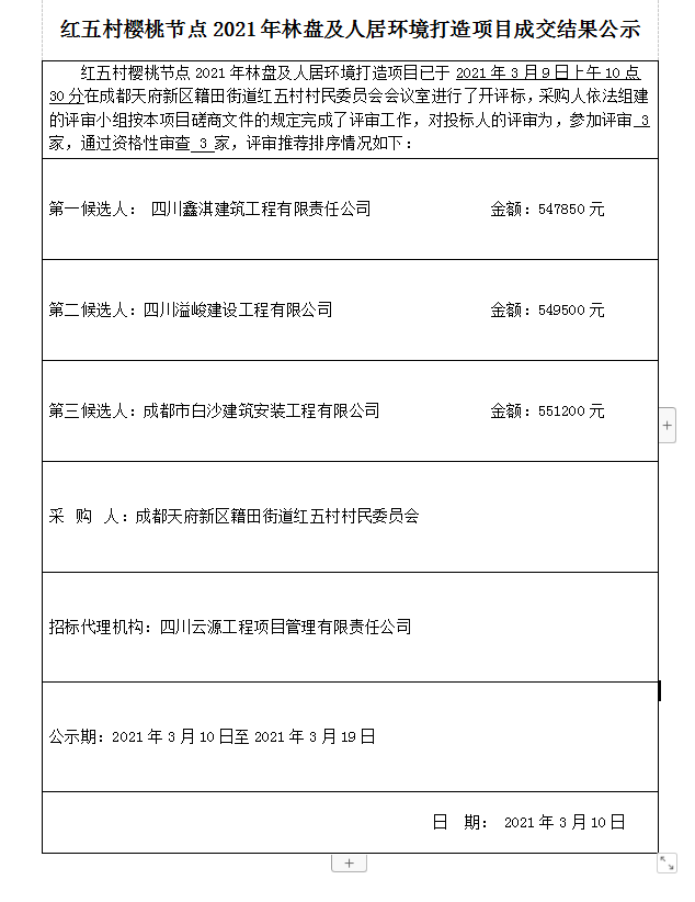 红五村樱桃节点2021年林盘及人居环境打造项目成交结果公告