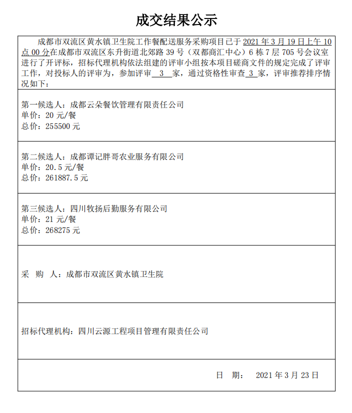 成都市双流区黄水镇卫生院工作餐配送服务采购项目结果公告