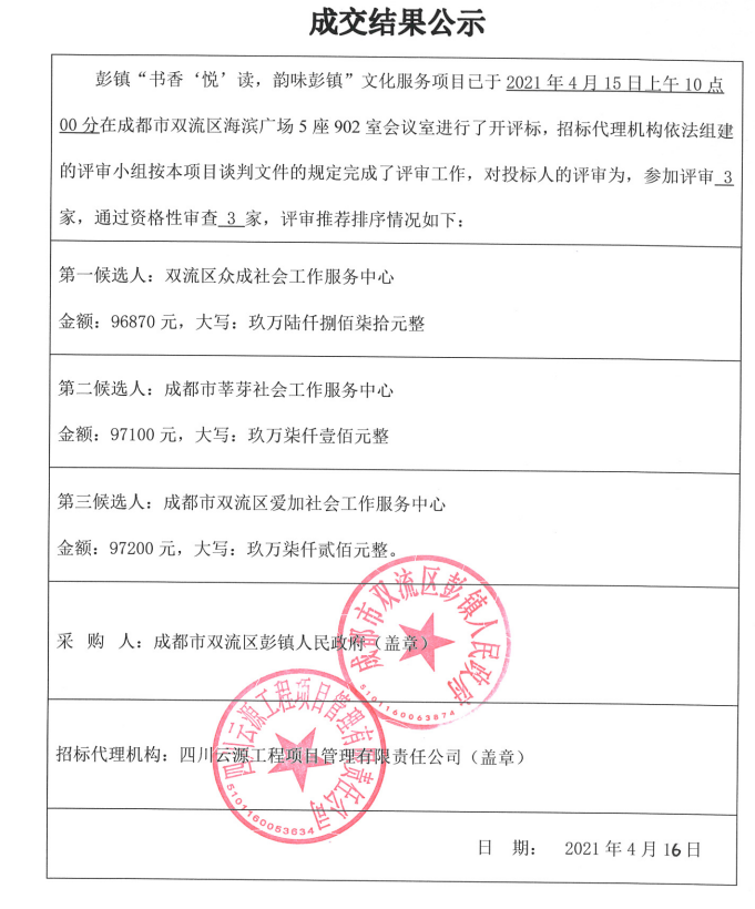彭镇“书香‘悦’读,韵味彭镇”文化服务项目成交结果公示