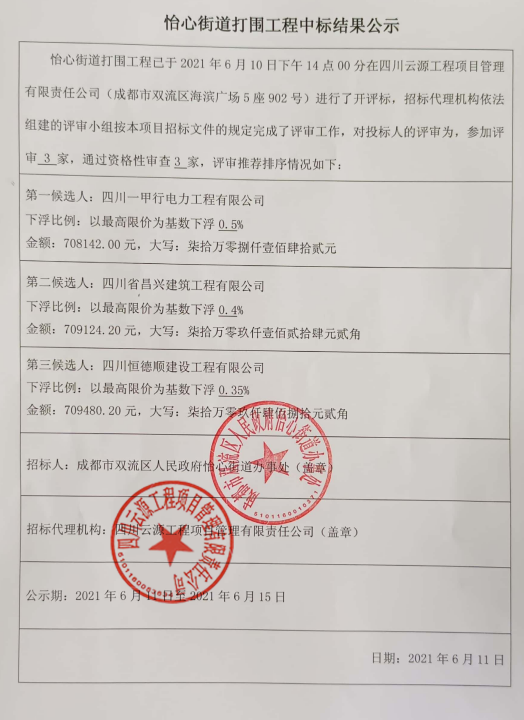 怡心街道打围工程成交结果公示