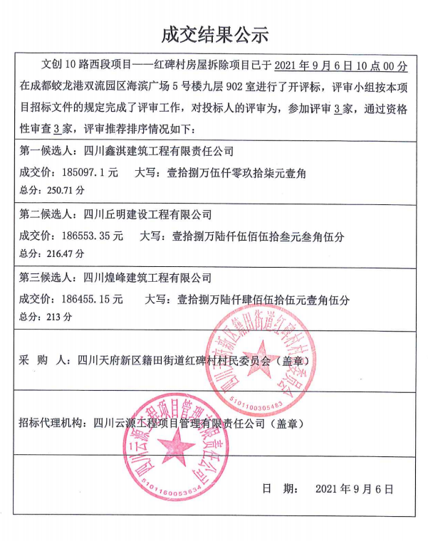 文创10路西段项目——红碑村房屋拆除项目成交结果公示