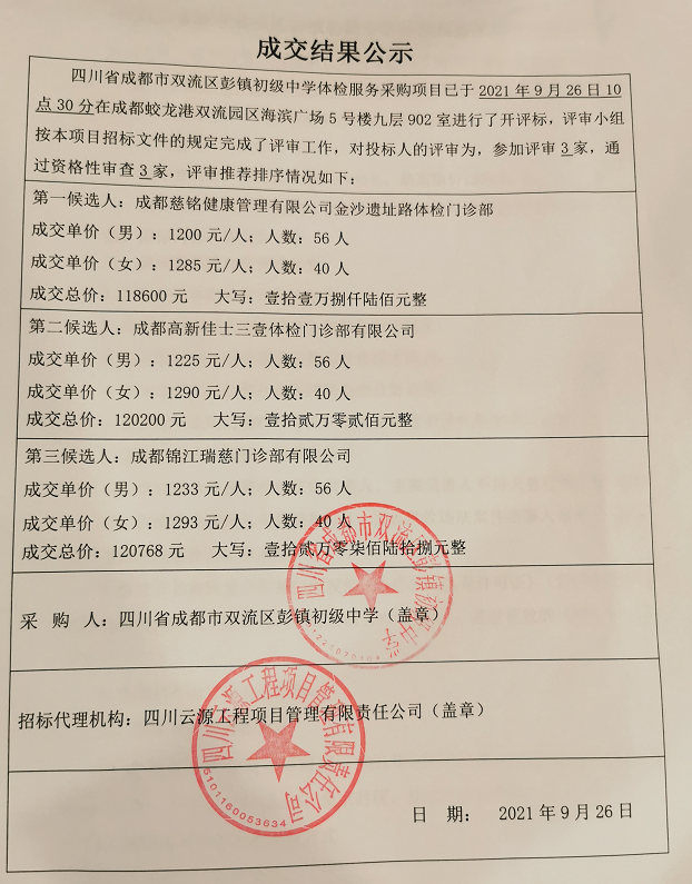 四川省成都市双流区彭镇初级中学体检服务采购项目成交结果公示