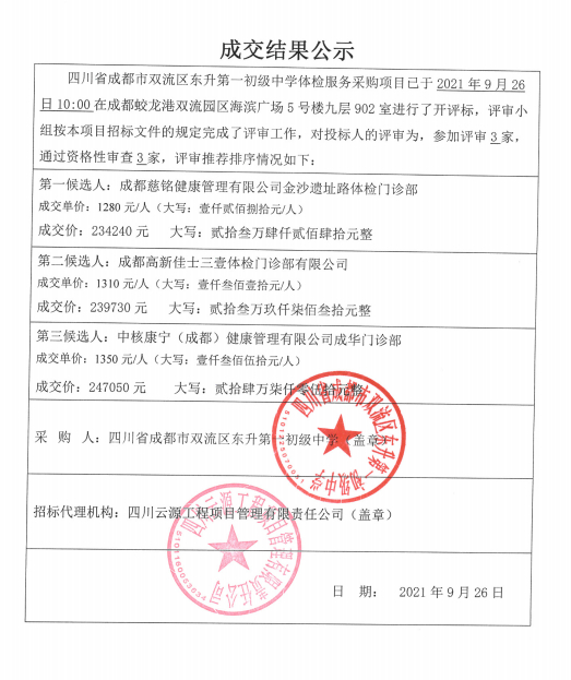 四川省成都市双流区东升第一初级中学体检服务采购项目结果公告