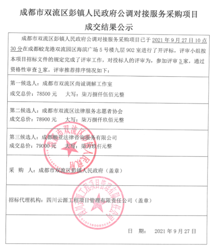 成都市双流区彭镇人民政府公调对接服务采购项目结果公告