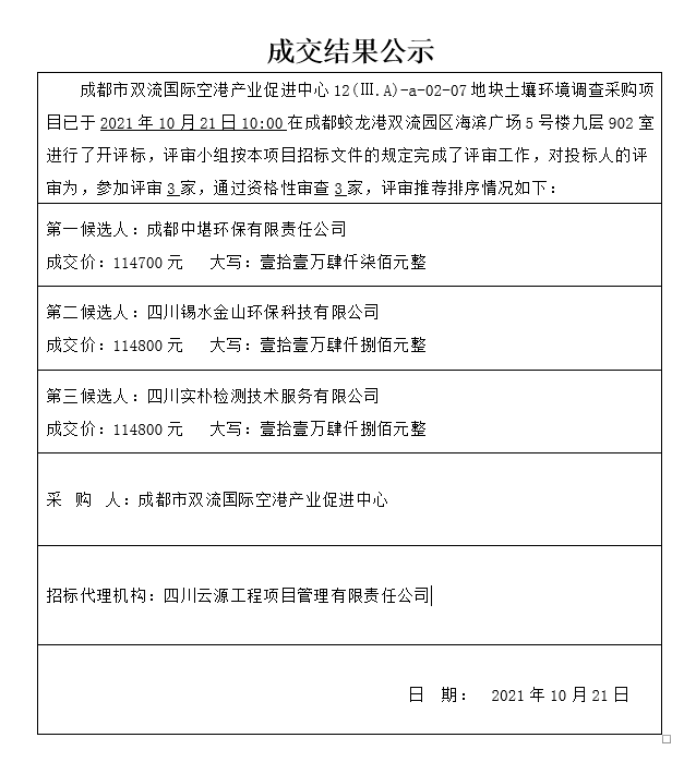 成都市双流国际空港产业促进中心12(Ⅲ.A)-a-02-07地块土壤环境调查采购项目成交结果公示