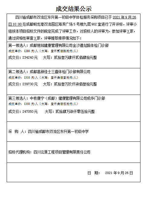 四川省成都市双流区东升第一初级中学体检服务采购项目结果公告