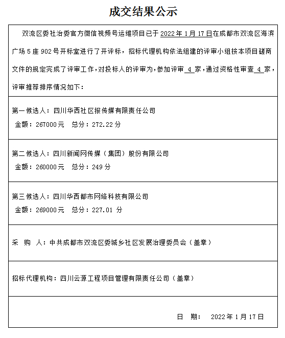 双流区委社治委官方微信视频号运维项目结果公告