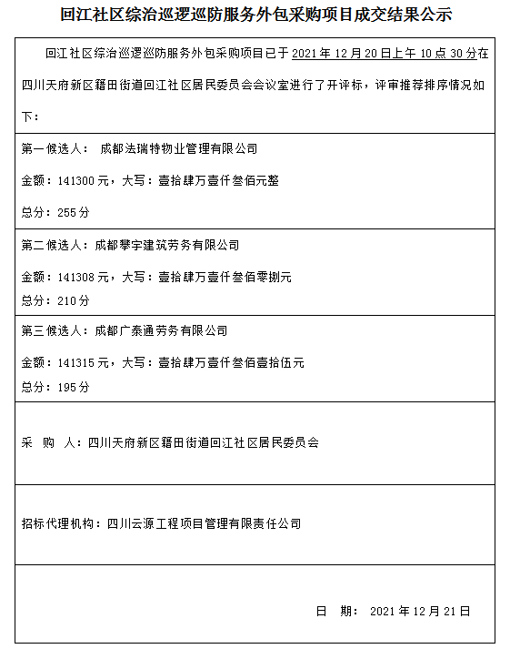 回江社区综治巡逻巡防服务外包采购项目成交结果公示