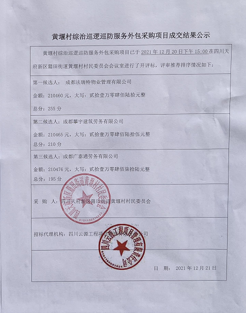 黄堰村综治巡逻巡防服务外包采购项目结果公告