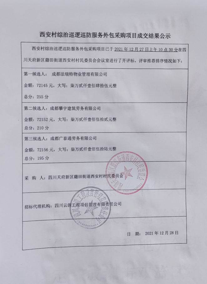 西安村综治巡逻巡防服务外包采购项目结果公告