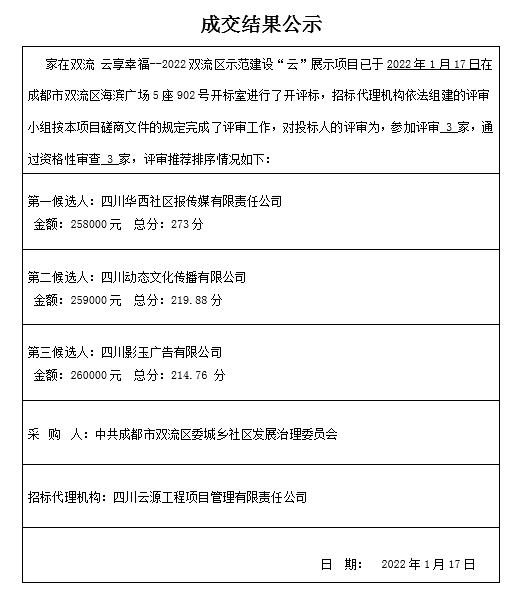 家在双流 云享幸福--2022双流区示范建设“云”展示项目成交结果公示