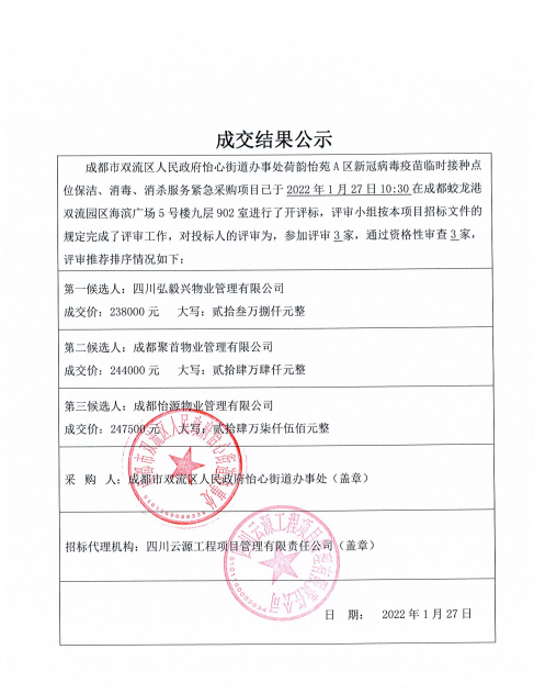 成都市双流区人民政府怡心街道办事处荷韵怡苑A区新冠病毒疫苗临时接种点位保洁、消毒、消杀服务紧急采购项目成交结果公示