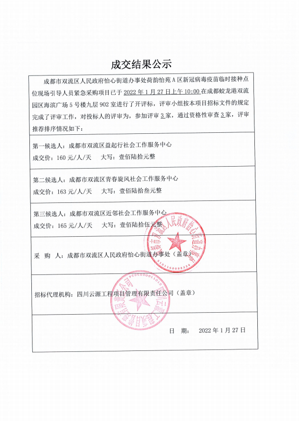 成都市双流区人民政府怡心街道办事处荷韵怡苑A区新冠病毒疫苗临时接种点位现场引导人员紧急采购项目结果公告