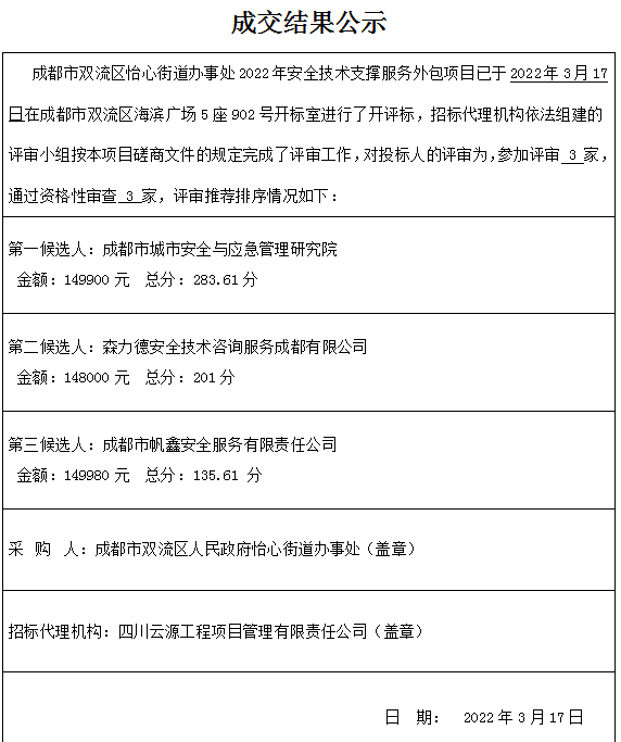 成都市双流区怡心街道办事处2022年安全技术支撑服务外包项目结果公示