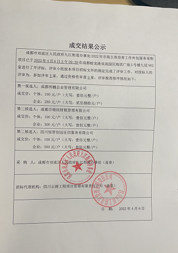 成都市双流区人民政府九江街道办事处2022年市场主体培育工作外包服务采购项目结果公告