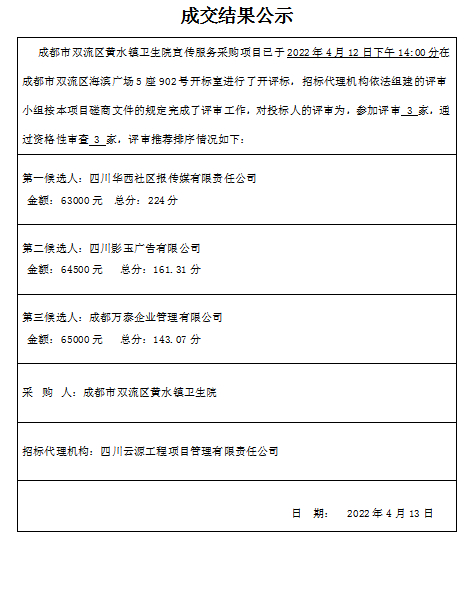 成都市双流区黄水镇卫生院宣传服务采购项目结果公告