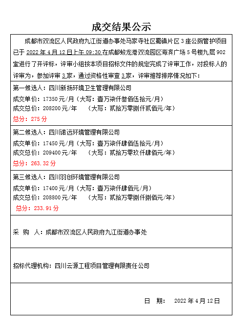 成都市双流区人民政府九江街道办事处马家寺社区蜀镇片区3座公厕管护项目成交结果公示