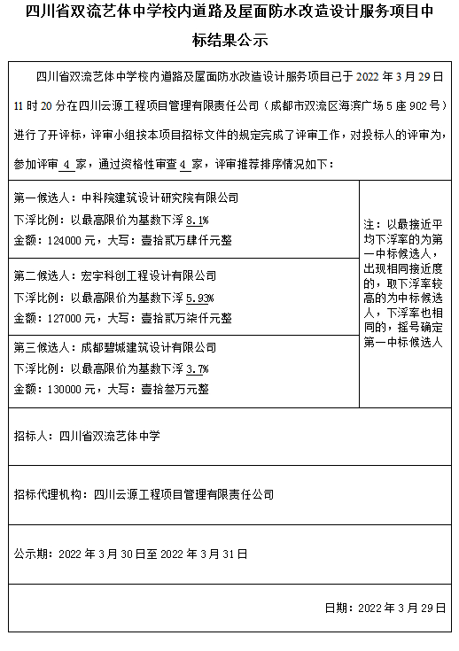 四川省双流艺体中学校内道路及屋面防水改造设计服务项目中标结果公示