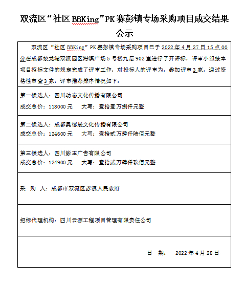 双流区“社区BBKing”PK赛彭镇专场采购项目成交结果公示