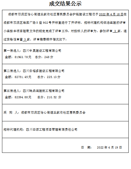 成都市双流区怡心街道兰家沟社区居民委员会护堤建设工程结果公告