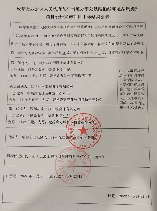 成都市双流区人民政府九江街道办事处铁路沿线环境品质提升项目设计采购项目中标结果公示